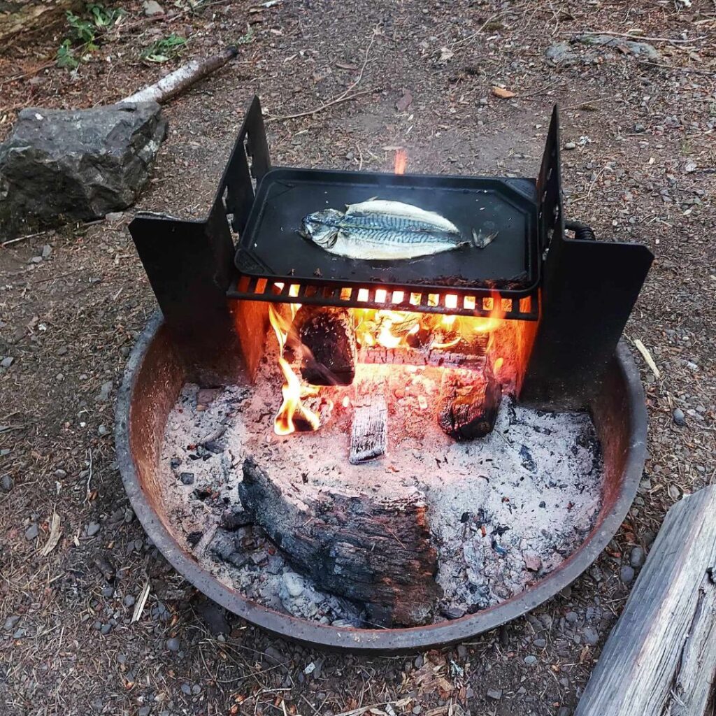 Tu jest naprawdę pełna dowolność. U nas wyglądało to tak, że czasem robiliśmy coś na ruszcie (jak jestem nad oceanem, to staram się jeść ryby tak często jak się da. Ryby smażymy na żeliwnej tacy. Czasem w drodze na pole kupujemy coś na wynos i zabieramy ze sobą. Czasem, kiedy nocujemy w miejscu z dostępem do kuchni, przygotowujemy coś na później, np. sałatkę, kanapki. Czasem zabieramy rzeczy do przenośnej chłodziarki. To wszystko zależy od tego, na co mamy akurat ochotę.