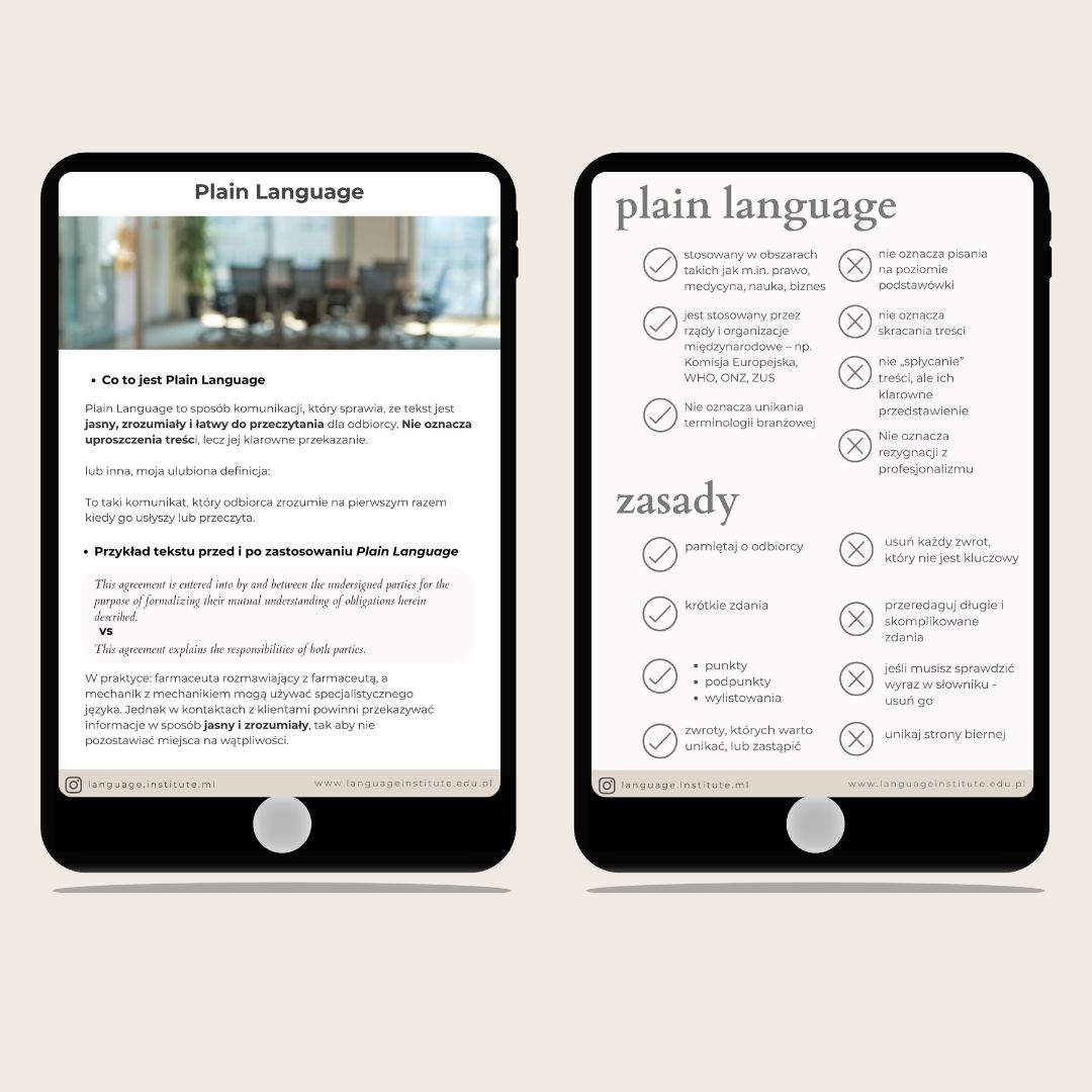 ✅ czym jest Plain Language i dlaczego warto go stosować ✅ przykłady tekstów „przed i po” ✅ listę trudnych słów z prostszymi odpowiednikami ✅ zasady skutecznej komunikacji ✅ ćwiczenia praktyczne